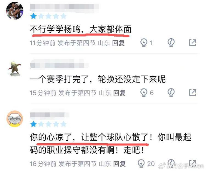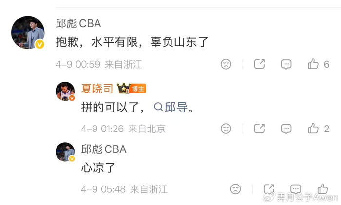 上一轮山东以6分之差惜败广厦的赛后,邱彪在社媒表示:“抱歉,水平有限,辜负山东了。”山东媒体人回复:“拼的可以了,邱导。”但邱彪的回应是:心凉了